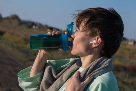 Indispensable thing. Woman relaxing after workout outdoors. Copy space on the right side