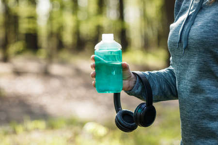Woman drinking water from bottle and holding headphones. Resting during jogging and running in forest. Fitness and sport activity