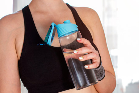 Front view on hands of unknown caucasian woman female athlete holding plastic bottle supplement shaker while training at gym real people copy space