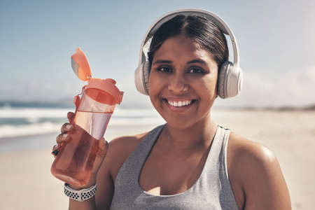 Im always prepared. Shot of a young woman wearing headphones and holding her water bottle while out for a run.