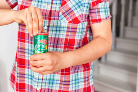 Tambov, Russian Federation - September 04, 2019 Person opening Perrier and Juice water can.