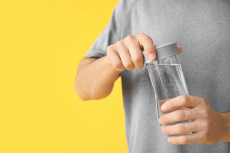 Young man with bottle of water on color background, closeup