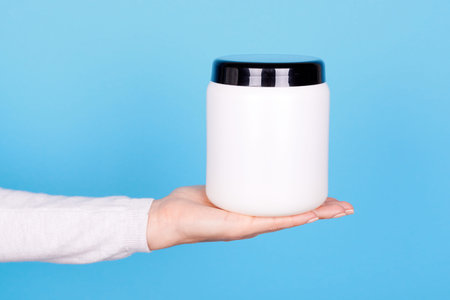 Female hand pours Shaker protein on a blue background, copy space.