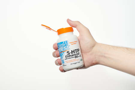 Doctors Best 5-HTP Enhanced in hand. 5HTP opened bottle with vitamin B6 and vitamin C. Veggie Caps, Non-GMO, Vegan, Gluten Free, Soy Free, Isolated white background - KALININGRAD, RUSSIA - 03.07.2020