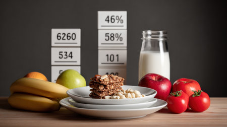 A balanced diet setup showcases an assortment of fruits, whole grains, and milk, complemented by detailed nutrition facts for awareness.