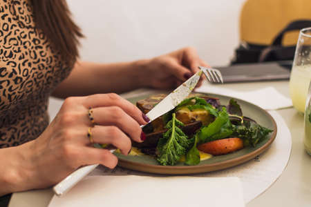 Delicious plate of vegetables and meats for lunch with woman's hands