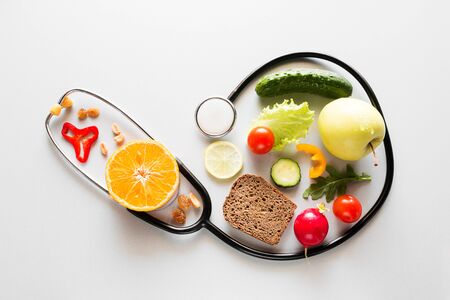 fresh fruits and vegetables and stethoscope healthy eating concept