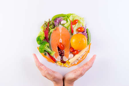 Diet, healthy lifestyle, weight loss, eating habits concept. Hands holding plate with fresh appetizing fruits and vegetables