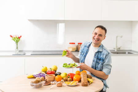 Young man eating a healthy salad, vegetables, healthy food.