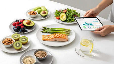 A table laden with healthy foods like salmon, asparagus, fruits, and nuts, alongside a tablet displaying nutritional data, suggesting a focus on diet and wellness.