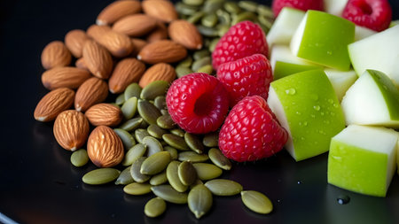 Healthy eating concept. Almond, melon, raspberry and pumpkin seeds