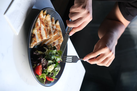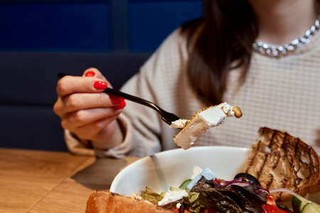 Woman eating tasty salad in cafe, closeup. Food delivery service