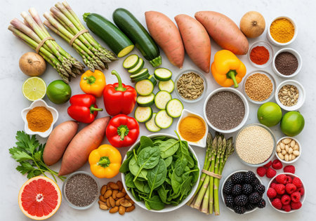 An overhead flat lay showcases a colorful assortment of fresh vegetables, fruits, nuts, seeds, and spices, representing a balanced and nutritious diet for health and wellness.