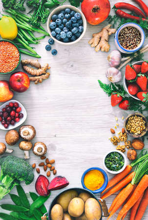 Healthy food background, frame of organic food. Ingredients for healthy cooking: vegetables, fruits, nuts, spices