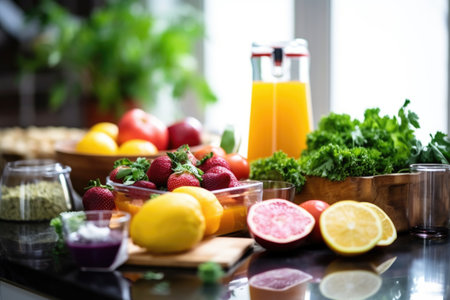 Lemons, cucumbers, and other ingredients arranged on a table, A modern, minimalist depiction of a clean and healthy eating lifestyle