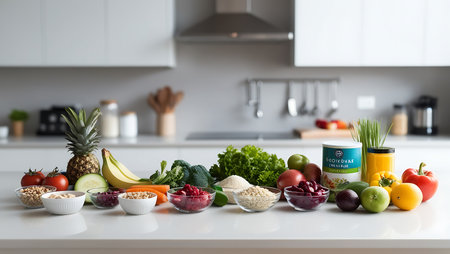 Fresh vegetables and fruits on a white table in a modern kitchen.