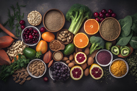 Health food selection with vegetables, fruits, herbs, pulses, seeds and nuts. health concept. Generative AI