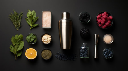 Collection of ingredients for cocktail making on a dark table