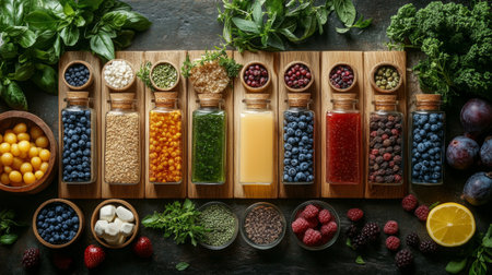 A diverse composition of nutritious food items elegantly presented in a balanced arrangement.
