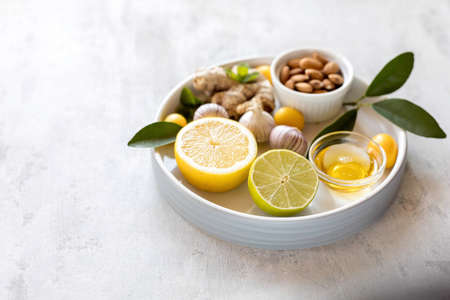 Immunity booster set of lemon, lime, garlic, ginger, honey, almond. Superset for the immune system against seasonal viruses