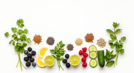 Various organic ingredients such as seeds, nuts, and herbs are displayed on a white background, offering empty space for additional text.