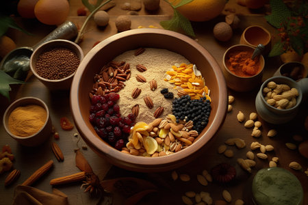 vegetables, spices, and other ingredients arranged in a beautiful and artistic way, created with generative ai
