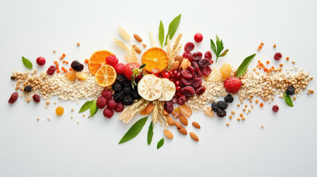 A visually appealing arrangement of dried fruits, nuts, grains, and fresh berries on a neutral background, highlighting health-conscious eating and vibrant colors.