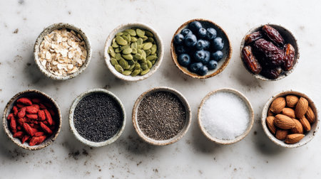 Healthy superfood ingredients in ceramic bowls including oats, pumpkin seeds, blueberries, dates, goji berries, chia seeds and almonds on marble surface.
