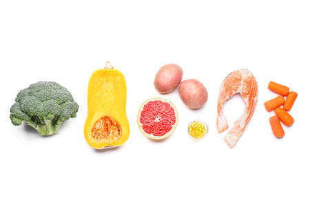 Healthy products with pills on white background