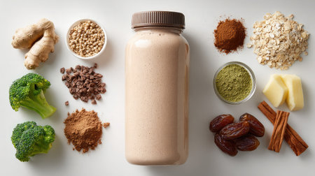 A vibrant arrangement of smoothie ingredients showcasing a blend of vegetables, spices, and natural sweeteners, ideal for healthy recipes.