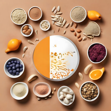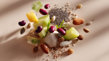This vibrant assortment of natural ingredients showcases various healthy elements, perfect for diet and nutrition concepts. Ideal for promoting wellness and culinary creativity.