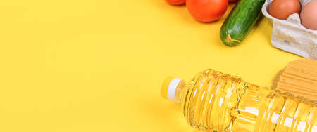 Various food items, fruits and vegetables on a yellow background. Delivery, donation, coronavirus, copyspace.