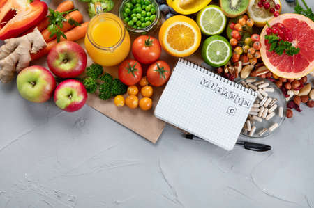 Foods high in vitamin C. Food rich in antioxidant, fiber, carbohydrates. Boost immune system and brain; balances cholesterol; promotes healthy heart. Top view, copy space, with notebook