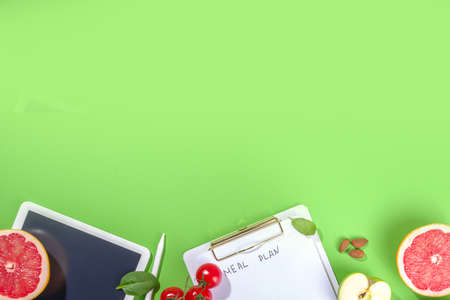 Meal diet plan concept, with in notepad, healthy food fruits, vegetables, tablet, notebooks and accessories for sliming on bright green table background