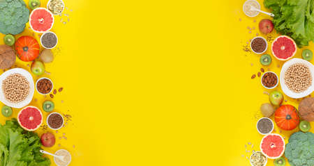 Fresh fruits and vegetables on yellow background. Healty food concept. Vegan and vegetarian diet eating. Foods high in vitamins and antioxidants. Top view with copy space