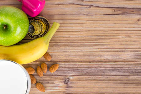 Close up top view of fruits, banana, green apple, almond, milk with measurement tape, light dumbell, healthy fit concept on wooden background.