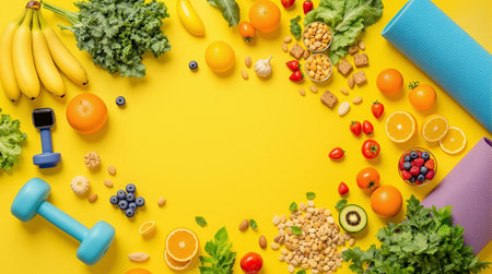 Vibrant fitness and nutrition concept with fresh fruits, vegetables, and exercise gear on yellow.