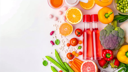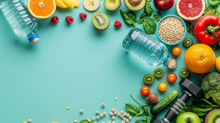 Promoting a healthy lifestyle with a vibrant arrangement of fresh organic fruits, vegetables, water, dumbbells, and pills on a turquoise background, leaving space for your message