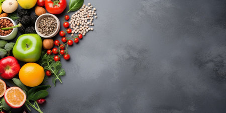 Healthy food clean eating selection: fruit, vegetable, seeds, superfood, cereals, leaf vegetable on gray concrete background copy space : Generative AI