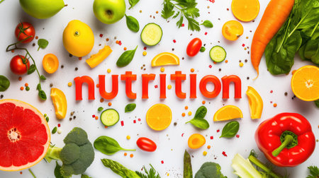 Nutrion title text food lettering, on table with juicy fruits around, kiwi, apples, strawberries, oranges and mandarin, raspberry and pineapple. High quality illustration