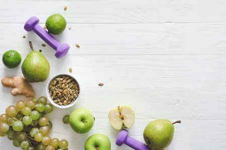 Diet Health eat and food for lifestyle health concept. Sport exercise equipment workout with fresh fruit and measuring tap for fitness style. Nutrition Healthy Lifestyle Concept, Top view and copy space