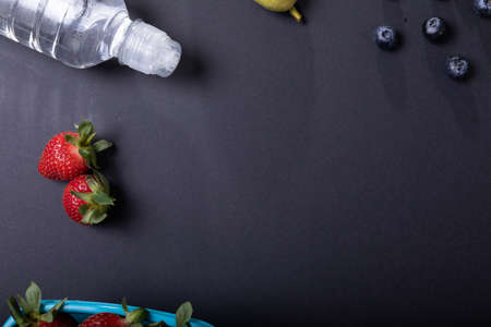 Overhead view of fruits with water bottle over black background, copy space. unaltered, food and healthy eating concept.