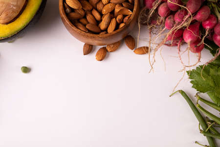 Overhead view of fresh almonds in bowl by vegetables and copy space on white background. unaltered, food, healthy eating, organic concept.