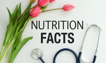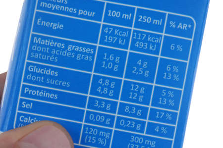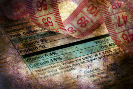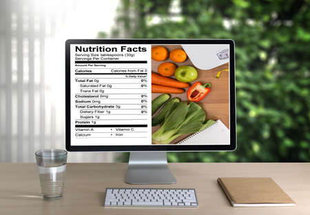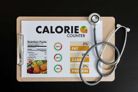 Healthy eating, dieting and weight loss concept - close up of nutrition facts on table