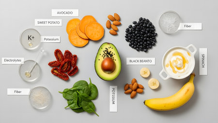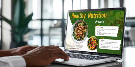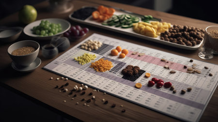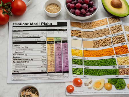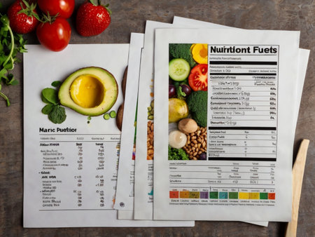 A balanced diet setup showcases an assortment of fruits, whole grains, and milk, complemented by detailed nutrition facts for awareness.