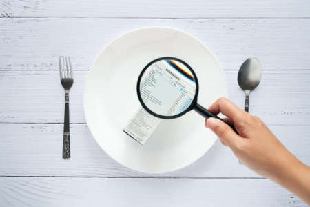 hand use the magnifying glass to zoom in to see the details of the nutrition facts label on the side of the consumer product box on white dish