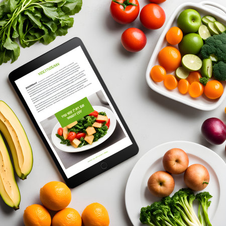 Smartphone with healthy meal planning app on a kitchen counter surrounded by vegetables and fruits