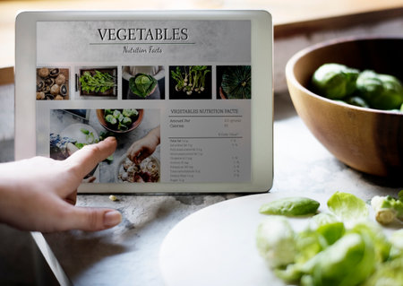 Healthy eating and dieting concept. Tablet pc with healthy food on table