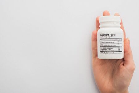 Person fingers on protein jar. Reading nutrition facts. Close-up.