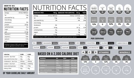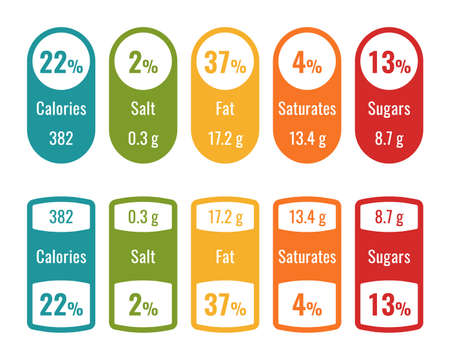 Label nutrition facts. Food value vitamin info, product mineral. Colorful indicators, calories and salt, fat sugar and saturated. Emblems with grams and percent vector isolated set